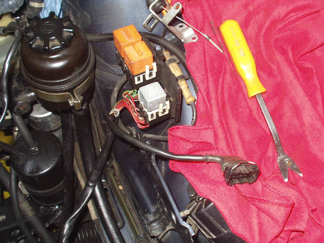 The 325e engine wiring harness can be removed and discarded since it cannot be used for the conversion. From inside the car, unplug the connector to the ECU (and also take out the ECU and idle control module [green box]), then pull the wiring harness through the firewall. Trace the wires back to various components such as the ignition coil, oxygen sensor, alternator, fuel injectors, fusebox, airflow meter, throttle position switch, idle control valve, oil pressure switch, coolant temperature sensor, crankshaft sensor, auxiliary relays, etc and disconnect every one of them. You’ll want to use a pick to take out the clips that hold the connectors. (Labeling the connections is somewhat useless since everything is going to be replaced with 325i parts.) Once it’s out, toss it aside.