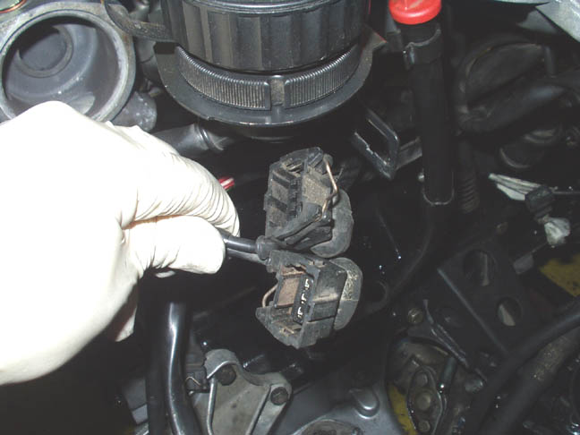 The diagnostic connector fits into the bracket that’s part of the wiring harness bracket, but the the next two plugs are the tricky part. Both are black, have three-prong connectors, and have the same type of release clip. Look closely at their direction, one is naturally upside down while the other one is right side up. This orientation matches with the bracket just below the diagnostic connector. The one that has the release clip upside down is for the ignition loom and is on the passenger side, while the one that is right side up clip is on the driver side of the bracket and is for the crankshaft reference sensor. Both wires go across the cover on the upper timing cover. (Just as a side note, if you cross the two wires the car will not start. So do it right the first time.)
