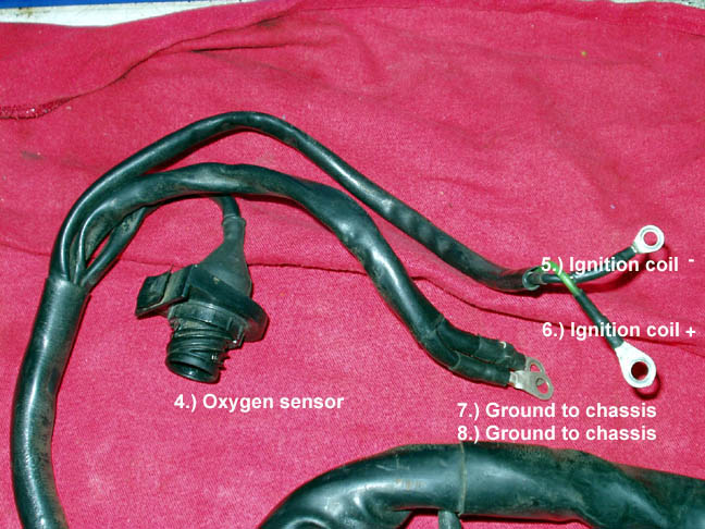 I left the O2 sensor connection dangling below until I bolted up the exhaust, then I wired the green and black wires to the ignition coil positive and negative, respectively. Now going the other way, I forced the thick wiring harness in the firewall holder and connected it to the fusebox.