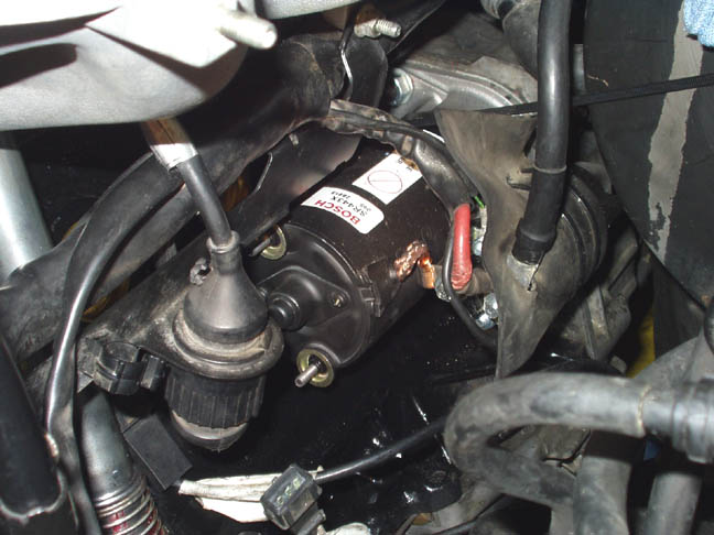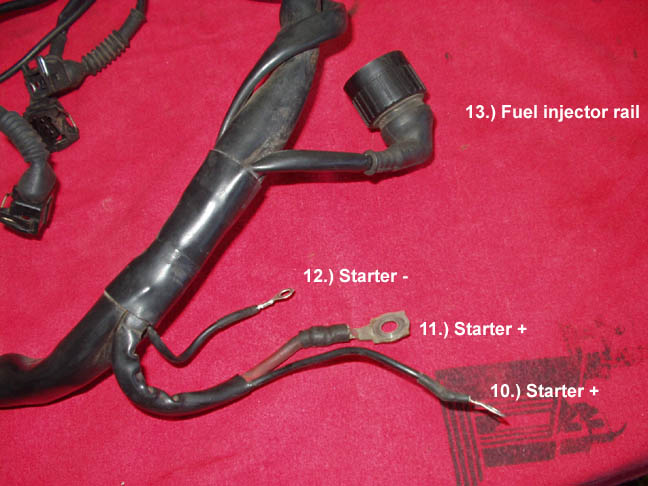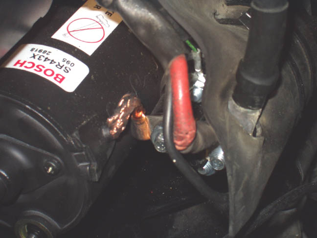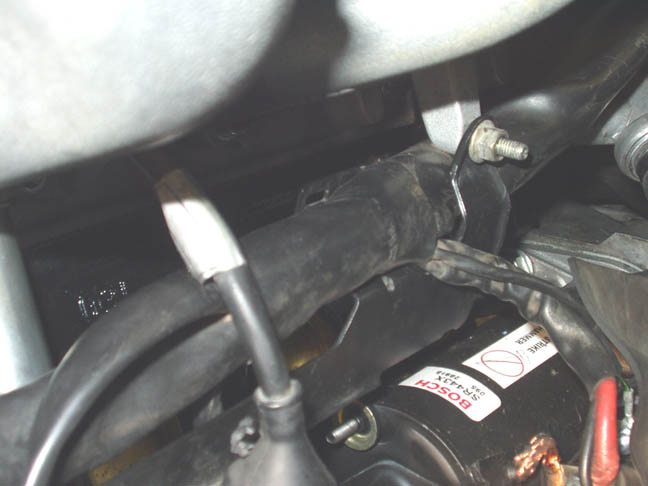 From there, the wiring harness dips below towards the block and is held in place by a metal bracket that attaches to the intake manifold. The first wires you connect are the starter negative and positive, but when you attach the red starter positive wire don’t forget to also connect the power wire that goes to the battery terminal: