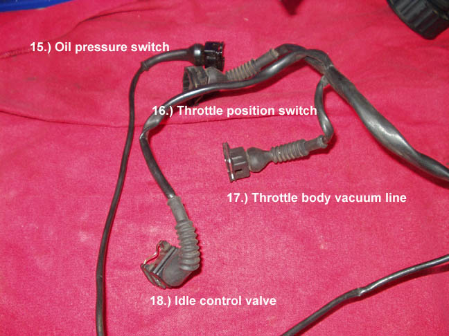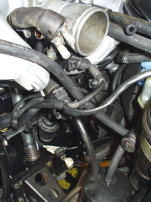 The next wires that come out of the harness are the ones for the throttle position switch, throttle body vacuum, and idle control valve. The TPS is self-explanatory and so is the ICV, but chances are you can’t connect the ICV since you don’t have the airbox or intake boot in But the throttle body vacuum connects to a weird looking nozzle hose, one end goes into the throttle body and the other plugs into the charcoal canister, located near on the driver side strut tower.