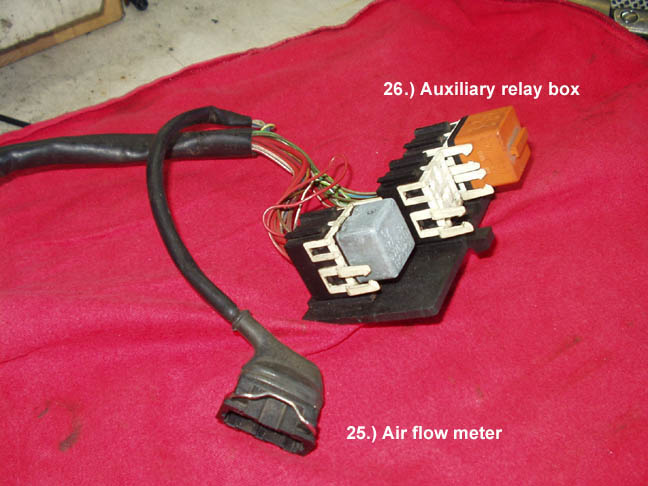 Next you’ll see one lone connector followed by a bunch of relays and another connector. The first lone connector is for the oil level sensor, the relays go into the auxiliary relay box, and the last one goes into the airflow meter, which shouldn’t be in yet. Don’t worry about the altitude sensor since the 325i doesn’t have one. If you are reusing the 325e airbox then the sensor will not be connected to anything anymore.