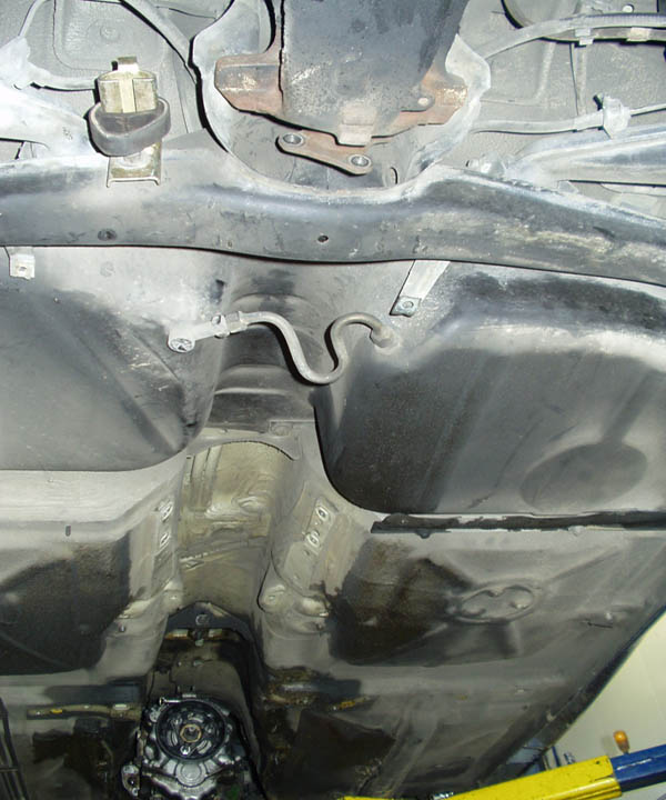 Jack up the car and take out the lower transmission/oil pan cover. You’ll need an E14 torx female socket and a 10mm socket. Once that’s out, you’ll have to drop the transmission to pull the engine out. (Well, you don’t have to since I’ve seen some people pull out the engine with the transmission.) In order to drop the transmission, you’ll have to drop the driveshaft, and in order to do that, you’ll have to take out the exhaust, heat shields, and transmission supports. My exhaust came out very quickly since the catalytic converter wasn’t attached to the cylinder head or the manifolds. All I had to do was remove the oxygen sensor (you don’t need that anymore), take out the rubber donut, and unscrew the two 10mm muffler hangar bolts. It is helpful to actually jack up the exhaust itself to remove the rubber donut. I removed the entire exhaust assembly as one unit. Unplug the oxygen sensor harness – it’s hidden behind the metal cover, runs to the battery tray inside the engine bay, and connects to the engine wiring harness.